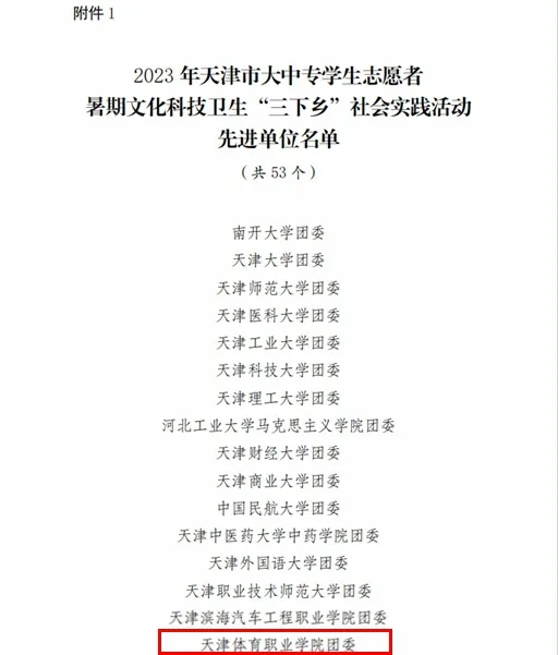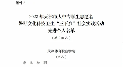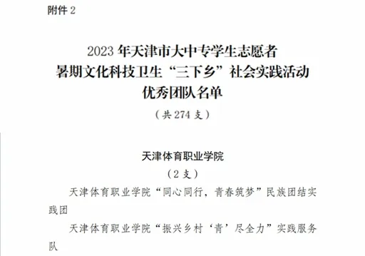 日前9️⃣,共青团天津市委员会、天津市学生联合会对在2023 年天津市大中专学生志愿者暑期文化科技卫生“三下乡”社会实践活动中表现突出的先进单位、优秀团队和先进个人进行通报表扬,我院荣获多项荣誉🎱。其中,学院团委组建的“同心同行,青春筑梦”民族团结实践团(带队教师张强)、“振兴乡村‘青’尽全力”实践服务队(带队教师李元)获评优秀团队,院团委委员李元😶、体育保健与康复系2021级2班学生和玥获评先进个人,我院获评先进单位。