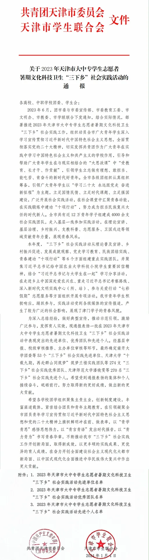 喜报 | 我院在天津市大中专学生志愿者暑期文化科技卫生“三下乡”社会实践活动中荣获多项荣誉